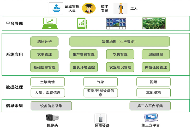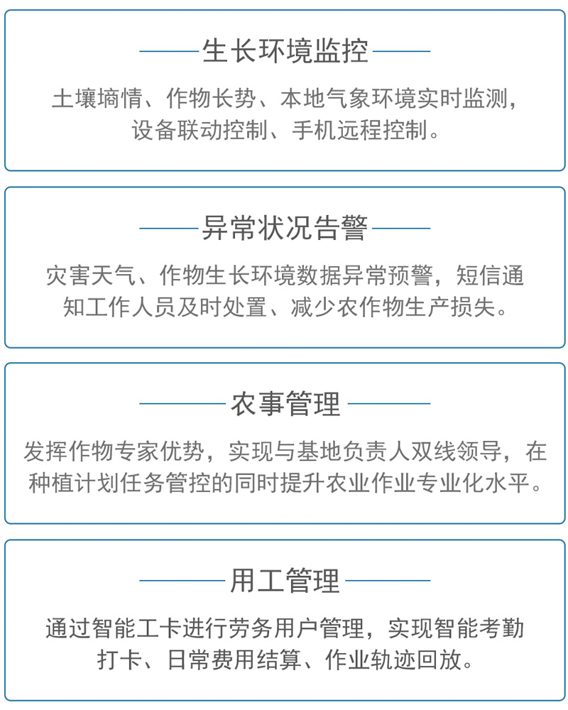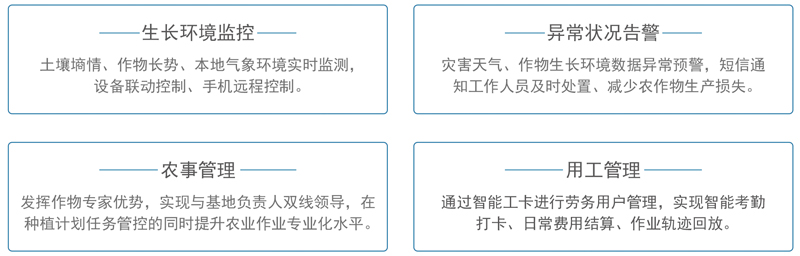 通过物联网、、大数据技术与农业生产经营相结合,,为农业生产者和管理机构提供覆盖从业人员培养、、、农机调度、、农产品生产与销售的全产业链智慧农业整体解决方案。。
